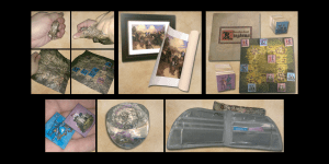 Photographs of other campaign related objects. Clockwise from Top Left: Illustrating the durability of the Tyvek game board, The canvas print of the original artwork for the Kingdoms campaign, The wooden game board and playing pieces, Illustrating the Tyvek game boards portability, The game cards during and after full submersion in water.