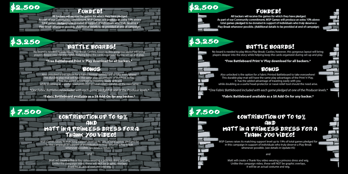 These are what the Funding Goals looked like. They allowed supporters to see how much funding the campaign had raised and if there were any special items that meeting the funding goal unlocked.