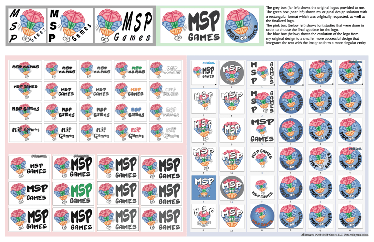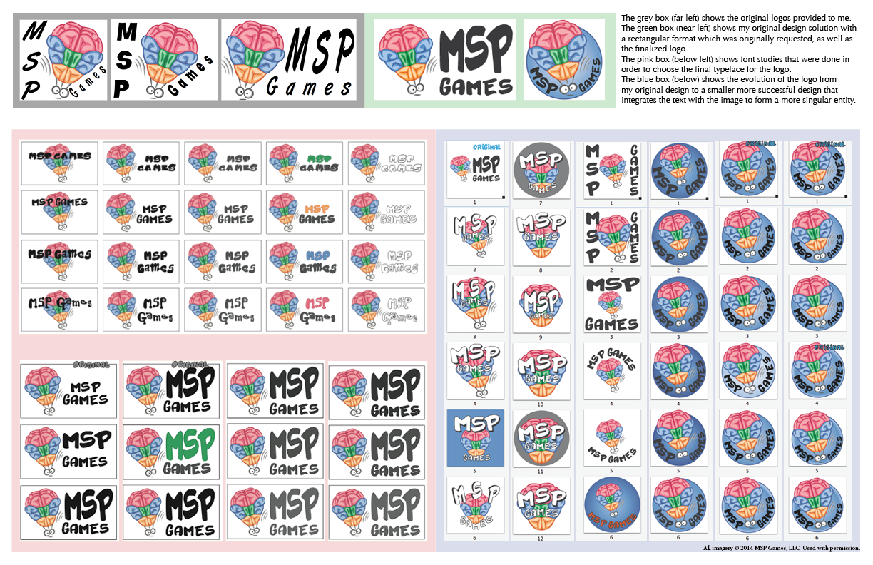 Bottom Right: Evolution of the logo from my original design to a smaller more successful design that integrates the text with the image to form a more cohesive logo.